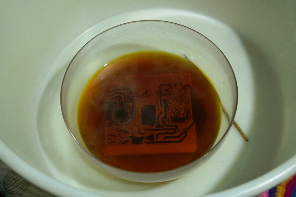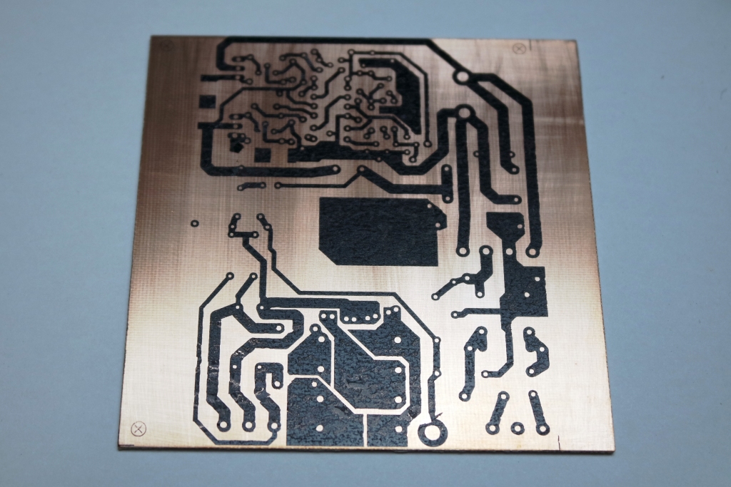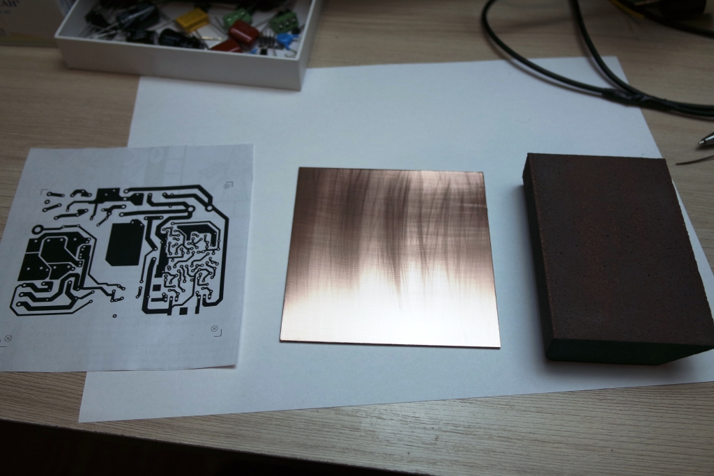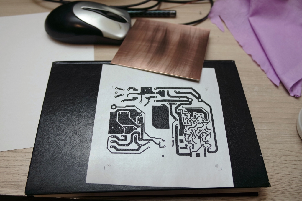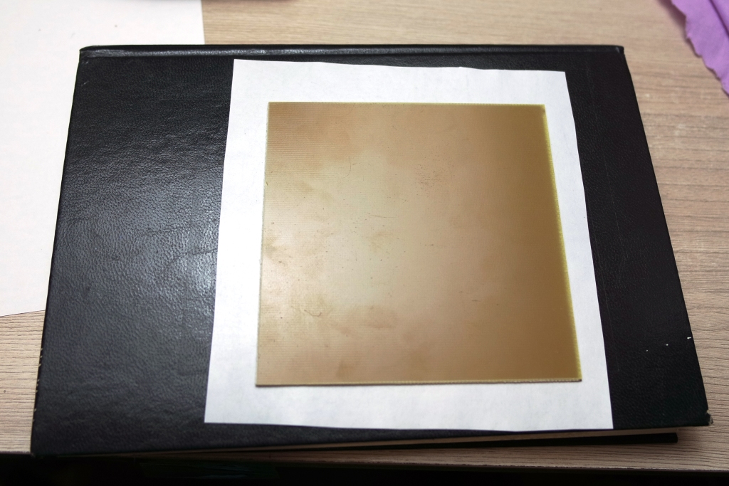 После убираем утюг, приживаем сверху текстолит еще парочкой книг, и даем немного остынуть. Далее подложка легко отрывается, а рисунок остается на медной поверхности:
