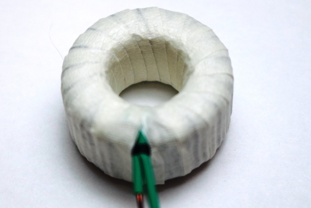 Вторичная мотается поверх первички, предварительно нужно изолировать обмотки друг от друга. Обмотка состоит из 70 витков провода 0,8 мм , межслойные изоляции ставить не надо.