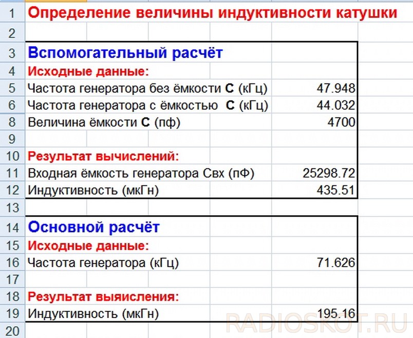 Результат замера обрабатывается в программке (программа в архиве, лист №10) – данные заносятся в разделе «Основной расчёт» в графе «Исходные данные», далее щелчок курсором вне основных полей программы и получаем результат – индуктивность составляет 195 мкГн. Первый расчёт нужно начать с заполнения раздела «Вспомогательный расчёт», для этого потребуется подключение параллельно поисковой катушке конденсатора ёмкостью более 1000 пФ (лучше 4500 пФ) фактический номинал которого известен с абсолютной точностью.