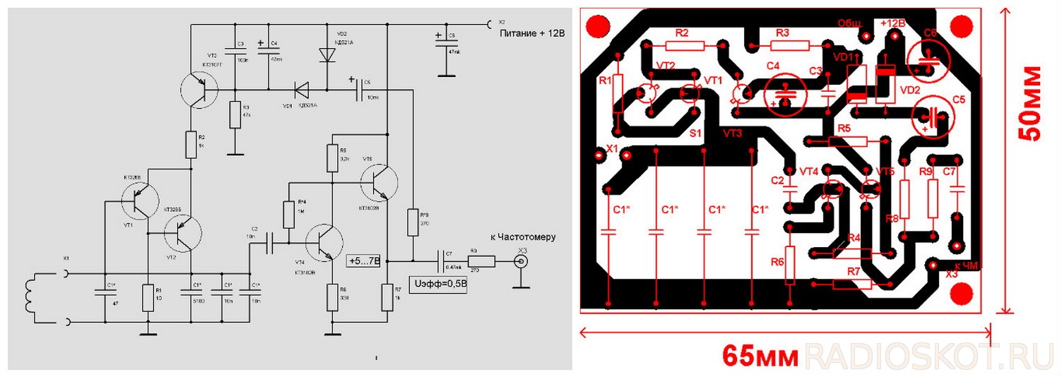 В схеме платы можно применять транзисторы КТ361Б, КТ361Г и КТ3701 с любыми буквенными маркерами, но для получения более точных измерений лучше использовать транзисторы с маркировкой КТ362Б и КТ363. Эти транзисторы устанавливаются на плате в позициях VT1 и VT2. На позиции VT3 необходимо установить кремневый транзистор со структурой p-n-p, например, КТ209В с любой буквенной маркировкой. Позиции VT4 и VT5 предназначены для буферных усилителей. Подойдет большинство высокочастотных транзисторов, с параметрами h21Э для одного не меньше 150, а для другого более 50.