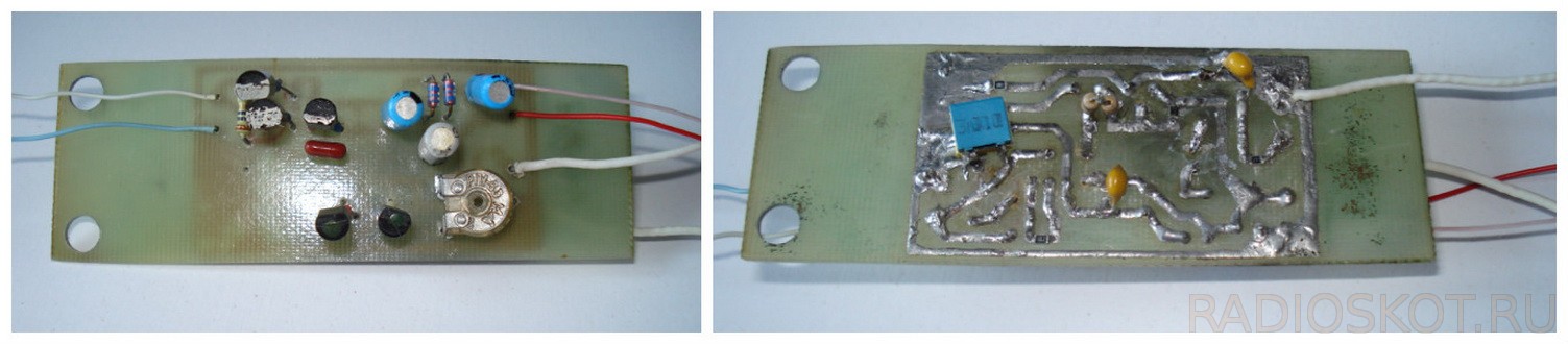 Учитывая предыдущий опыт, сразу доработал предложенную печатную плату под свои электронные компоненты, по сути же, схема осталась неизменной. Постоянный резистор R8 номиналом 270 Ом заменил на подстроечный 5 кОм (для установления нужной величины выходного переменного напряжения в интервале от 0 до более чем 5 вольт), резистор R9 и конденсатор С7 установил как в схеме, а не как на предложенной печатной плате.
