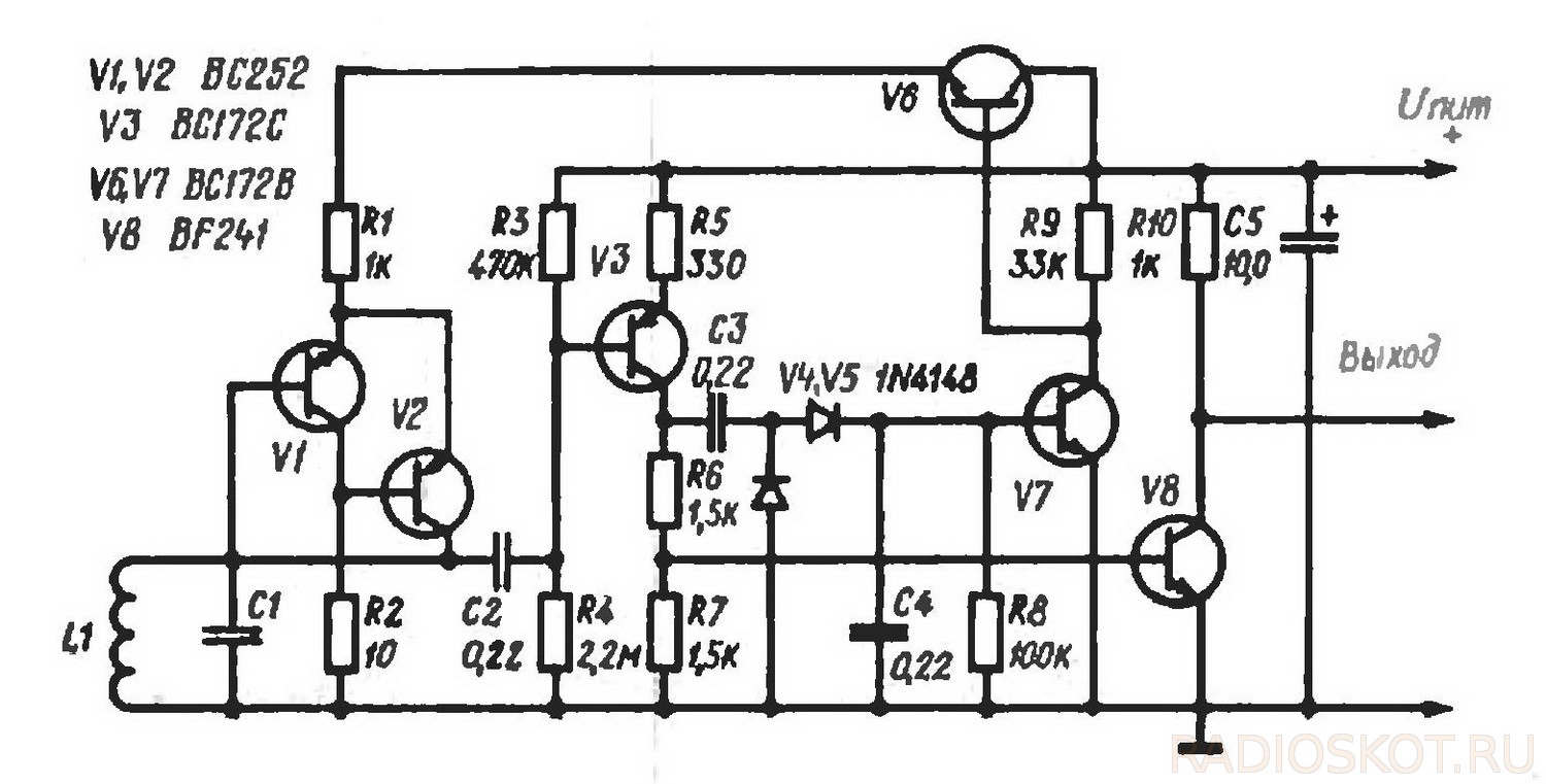 Далее цитата об этой приставке: этот прибор собирал, работает отлично, 5 копеек СССР свободно за 17 см берёт, но это по воздуху. Крупный металлический предмет около метра, ну и конечно есть недостатки — через каждые час-полтора приходится подстраивать резистор подстроечный СП-5 на 300 Ом в эмиттерной цепи, вот и вся настройка. Зато плюсов больше, нет никакой реакции на грунт, что руда — что песок, катушку не экранировал, питание одной кроны на месяц хватает. Конденсатор С3 обязательно не электролит. Резистор в датчике R1 установить 4,7 кОм и последовательно с ним 4,7-10 ком многооборотный типа СП-5, включаем прибор, если прибор реагирует на метал — крутить резистор пока он перестанет реагировать, затем в обратную сторону медленно, но постоянно, и когда генератор попадет в рабочий режим — услышим щелчок — это и есть его рабочая точка. Что касается катушки, 3-х литровая банка, намотано 200 витков с отводом от середины проводом 0,3 — 0,4, особой разницы нет, можно и 0,6, но тогда катушка тяжеловатая. В общем прибор работает супер! Подробнее здесь…