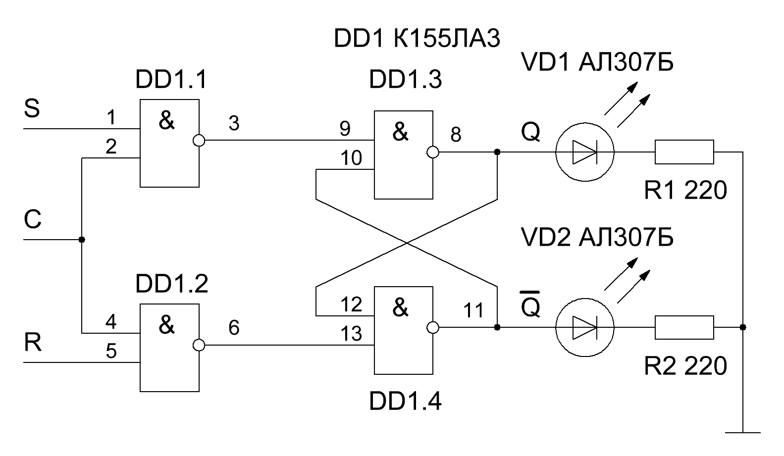 Логические элементы ИЛИ-НЕ с инвертированием сигнала образуют петлю положительной обратной связи. При таком соединении логическая единица на выходе одного логического элемента (ЛЭ) поступает на вход другого ЛЭ и обеспечивает логический ноль (инвертирование) на его выходе. Логический ноль на выходе ЛЭ, поступая на вход другого, при инвертировании дает логическую 1. Таким образом, выходы Q
