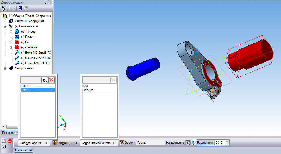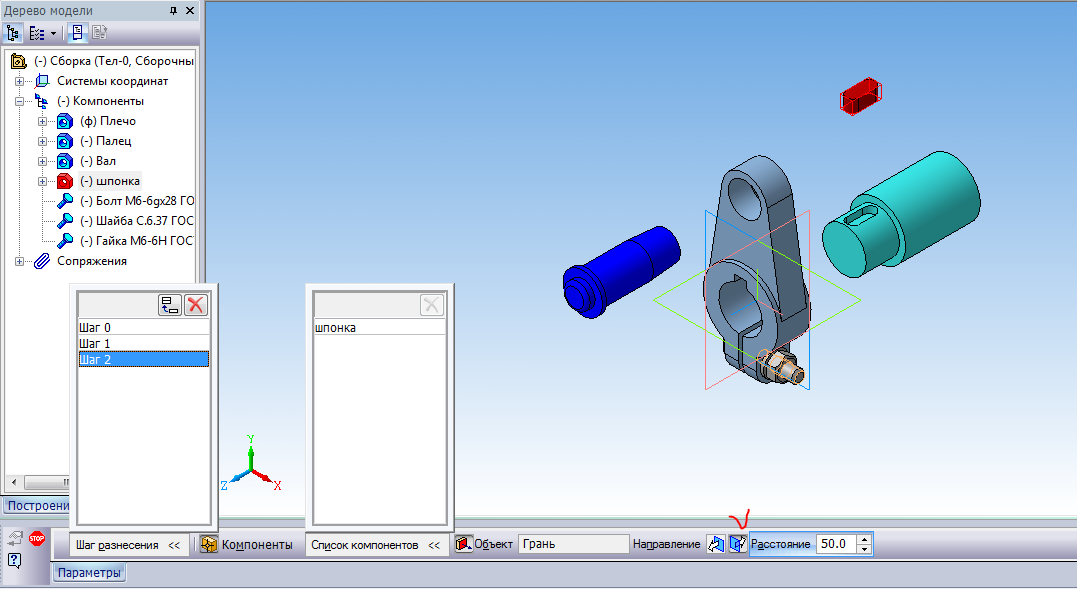 Теперь указываем направление разнесения, нажав по переключателю Объект. Палец «отодвигается» от передней грани Плеча в прямом направлении на 50 мм.