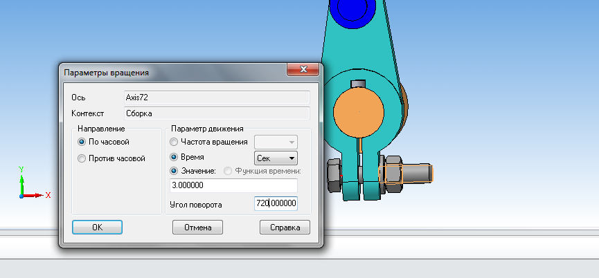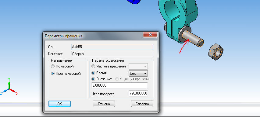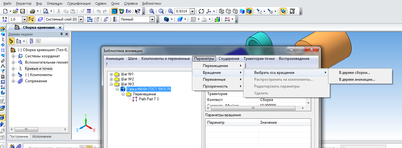 Для создания эффекта свинчивания гайки с болта делаем следующее: Параметры — Вращение — Выбрать ось вращения — В дереве сборки.