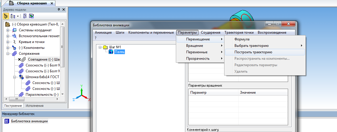 5. Затем выбираем его в Дереве анимации, переходим во вкладку Параметры — Перемещение- Построить траекторию.
