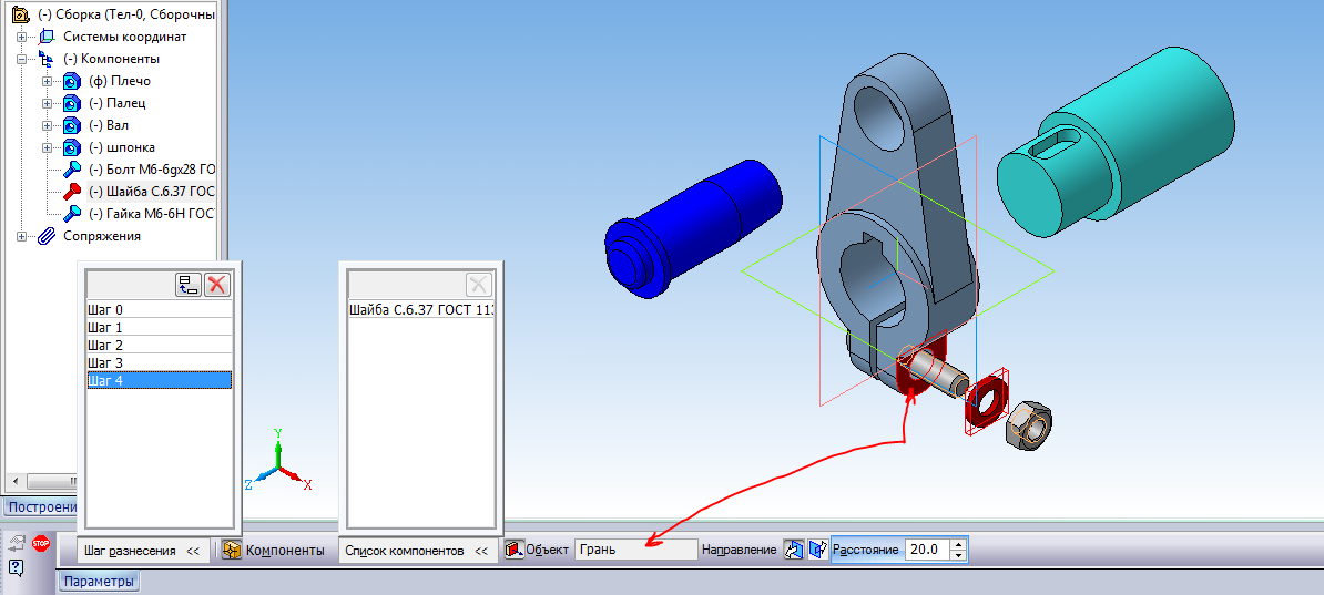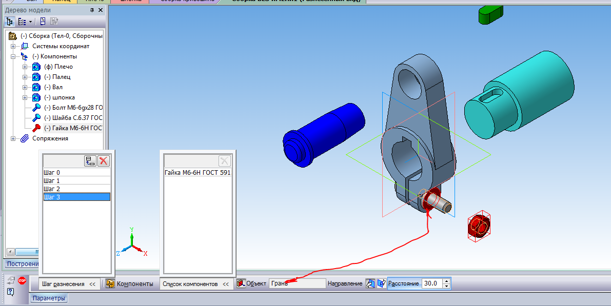 2. Укажите в Дереве модели компонент, который необходимо разносить — Гайка. Имя выбранного компонента отразится в окне Список компонентов.