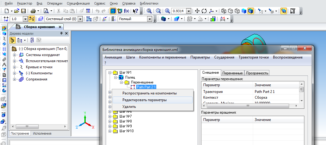 7. Во вкладке Шаги выбираем команду Добавить шаг. Выбираем Вал в дереве сборки. Повторяем пункты 4 — 6 .