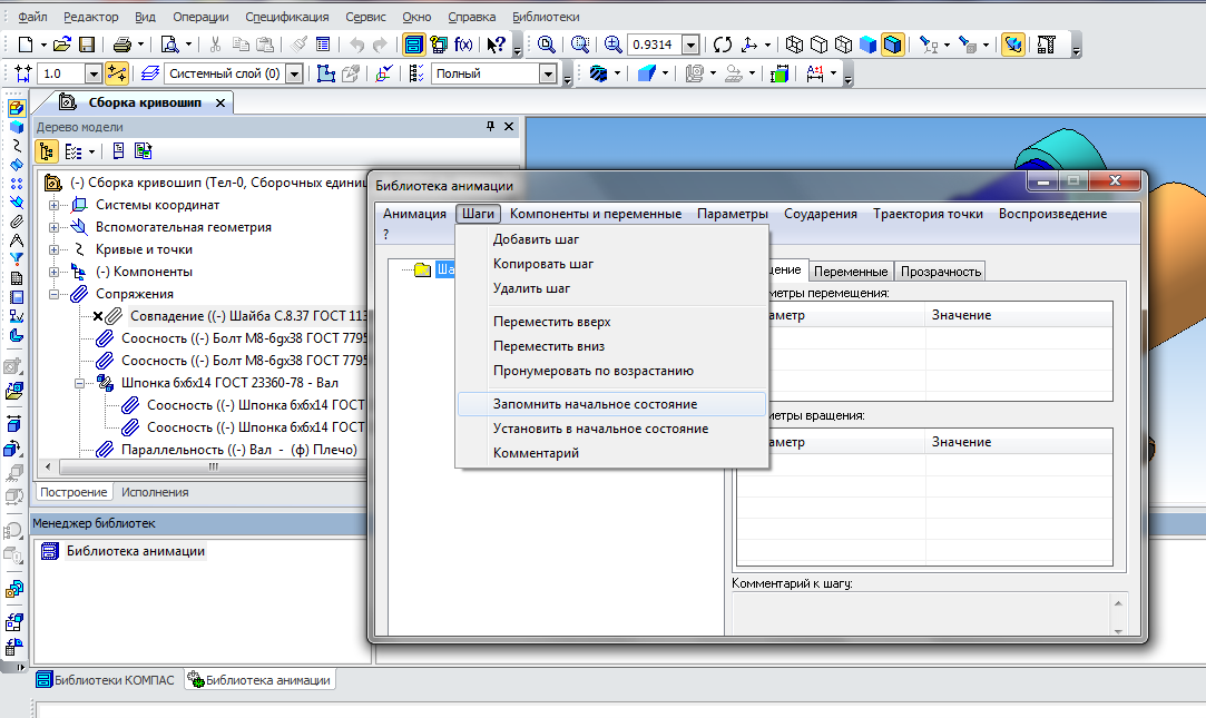 3. В появившемся окошке переходим во вкладку Шаги, открываем ее и выбираем команду Запомнить начальное состояние, чтобы перед запуском анимации вернуть компоненты в состояние до разборки-сборки.