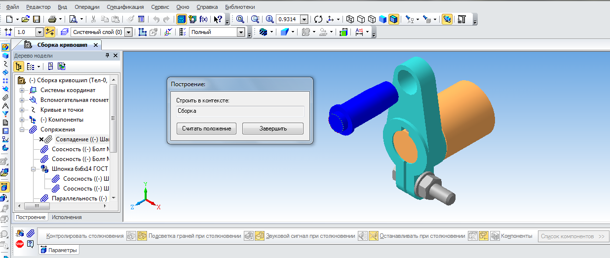 Поэтому для Пальца, Вала и Шпонки устанавливаем одно сопряжение — Соосность. Совпадение делать не будем, т. к. оно мешает перемещению компонентов в продольном направлении.