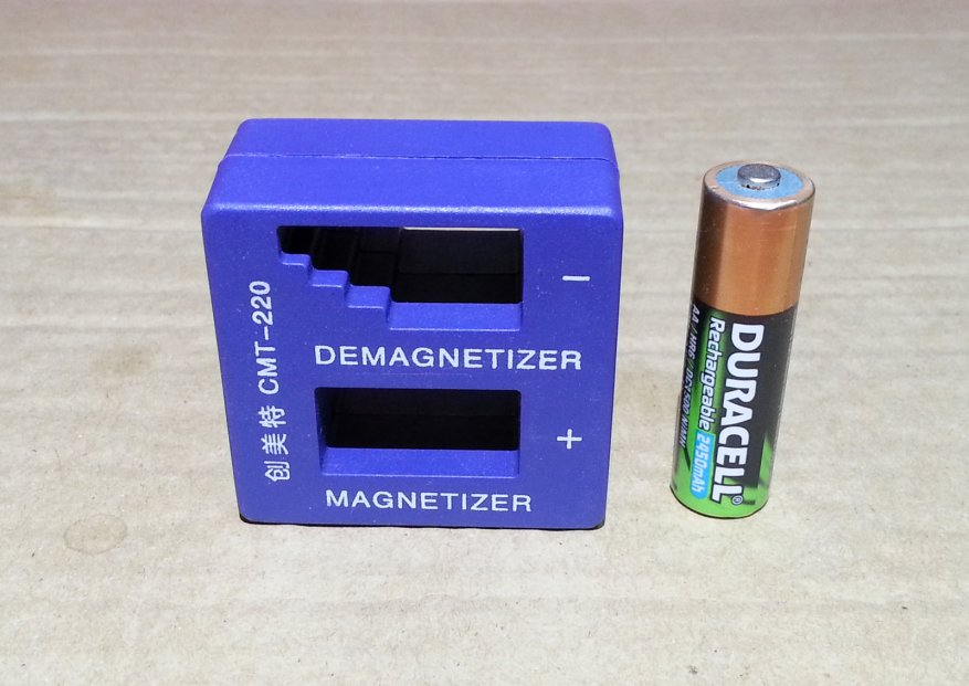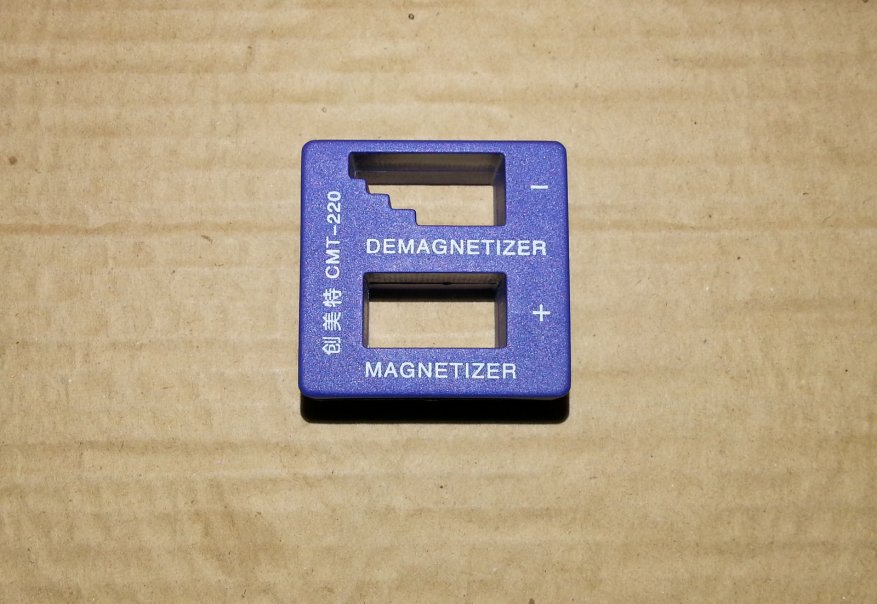 Как видите, всё просто: два пространства, верхнее размагничивает, нижнее, наоборот, намагничивает. В желаемое помещается инструмент и держится там около десяти секунд, после чего он готов к использованию.