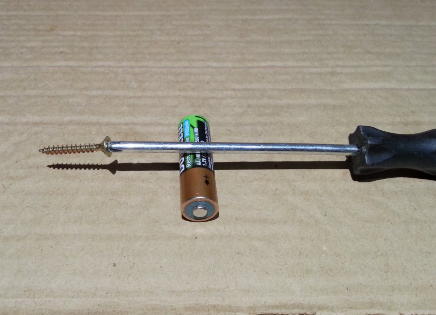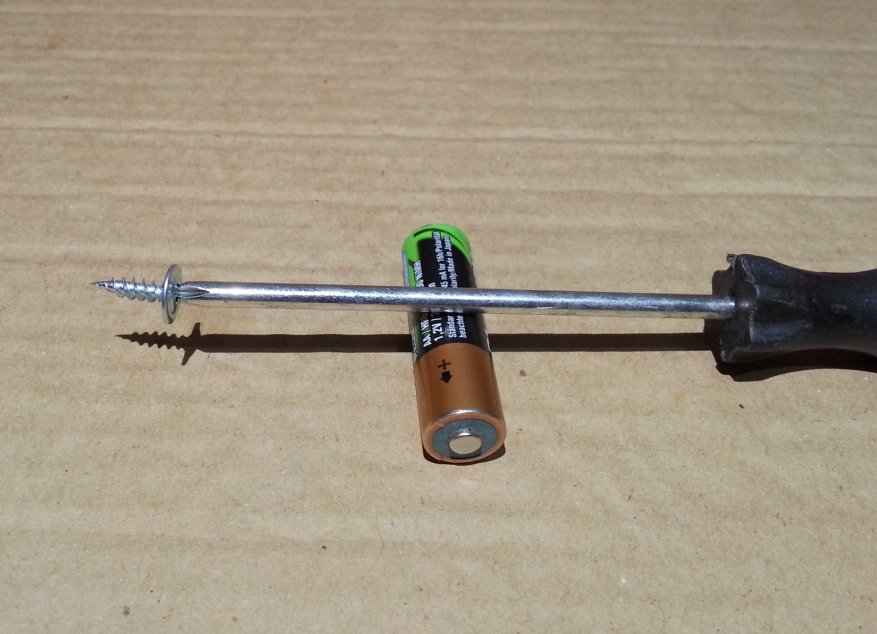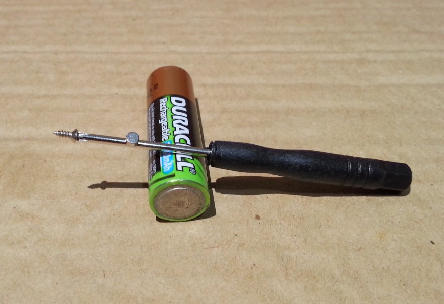 Я использовал обычную немагнитную отвертку и несколько саморезов. Достаточно было один раз провести жалом в положительном отверстии, как отвертка приобрела выраженные магнитные свойства: