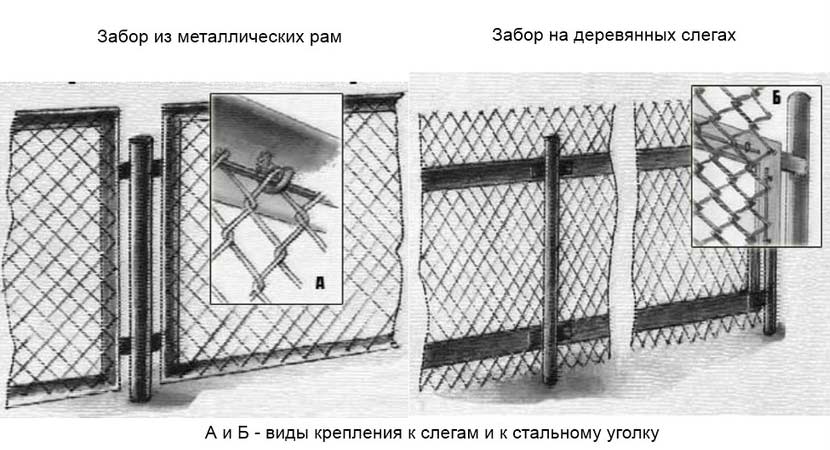 Метод крепления рабицы на столбы зависит от выбранного материала. Для деревянных или бетонных опор применяют различное крепление.