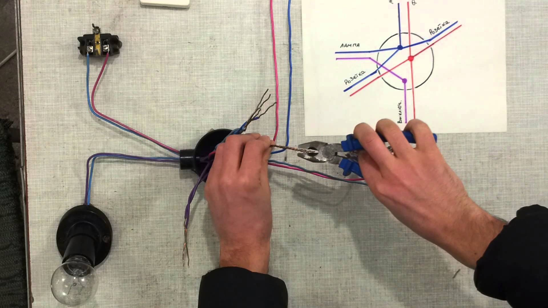 Схема выключателя и розетки питания через одну распределительную коробку.