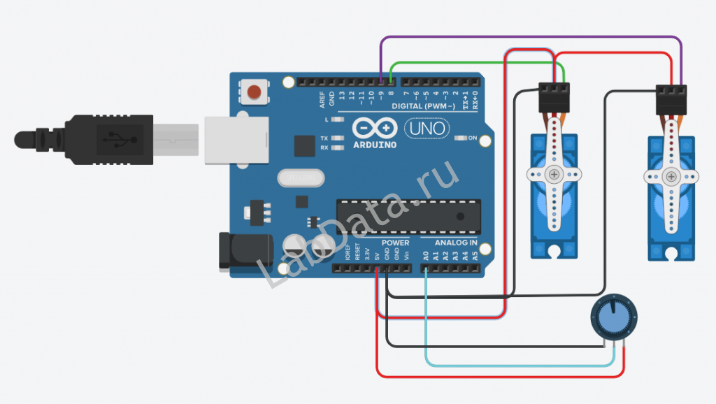 Подключение двух сервоприводов и датчика к Ардуино