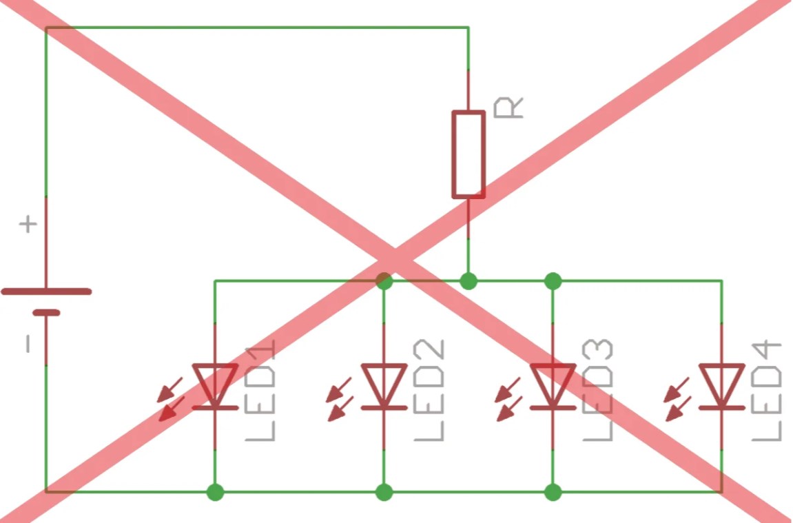 Каждый светодиод имеет прямое напряжение, которое может незначительно отличаться от одного светодиода к другому — даже в пределах одной и той же серии. Ток для всех 4 LED течет от резистора и распределяется между диодами. В этом случае на светодиодах будет выставлено одно напряжение, потому что они включены параллельно. Сколько это будет? Неизвестно.
