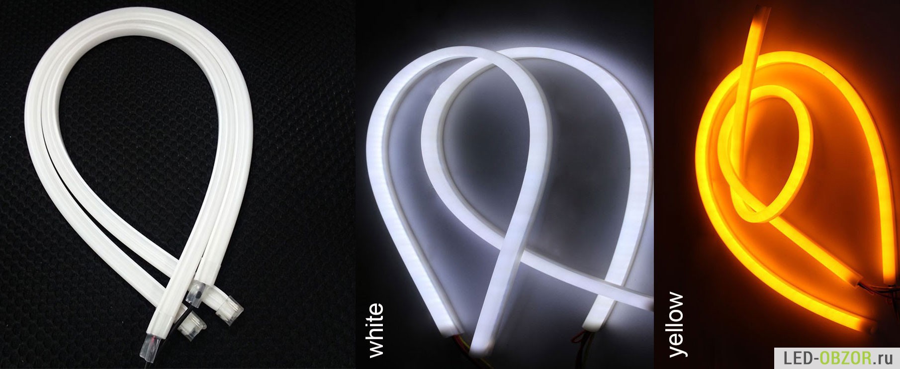 3. Светодиодная лента для авто помещена в ПВХ трубку длиной см., световая полоса получается без разрывов, не видно отдельных светодиодов. Цвет бывает белый или желтый. Крепится любой стороной.