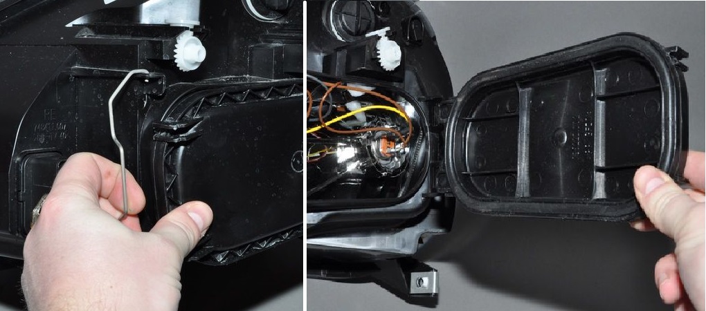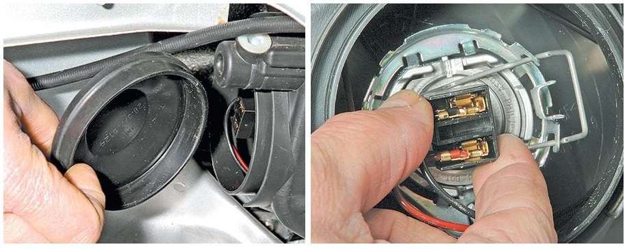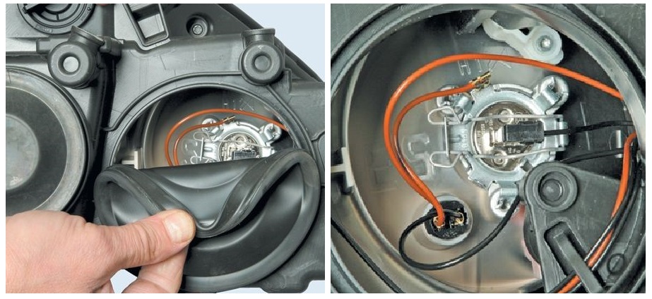 - Далее с тыльной стороны блок-фары надо демонтировать резиновый кожух, прикрывающий отсек ближнего света, который расположен ближе к крылу автомобиля;