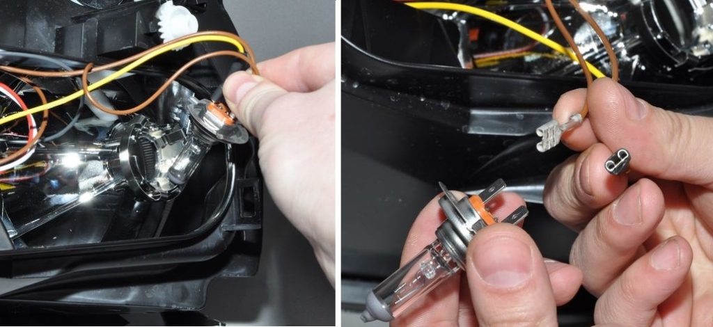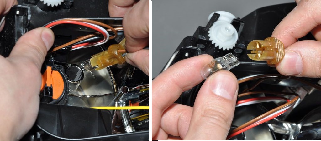 - Далее конструкция собирается в обратном порядке – патрон с лампой вставляется в блок фару и фиксируется пружиной, после этого подключается колодка к контактам. Далее нужно установить на место резиновый кожух;