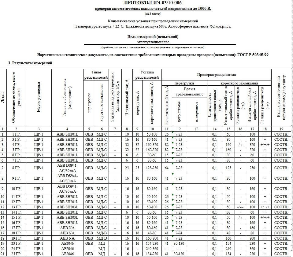 Все результаты проводимых работ заносятся в протокол. В документе отражается величина наводимого ампеража и время срабатывания автомата. Протокол прогрузки подписывается лицом, проводящим испытания. Образец заполнения протокола проверки предоставлен ниже: