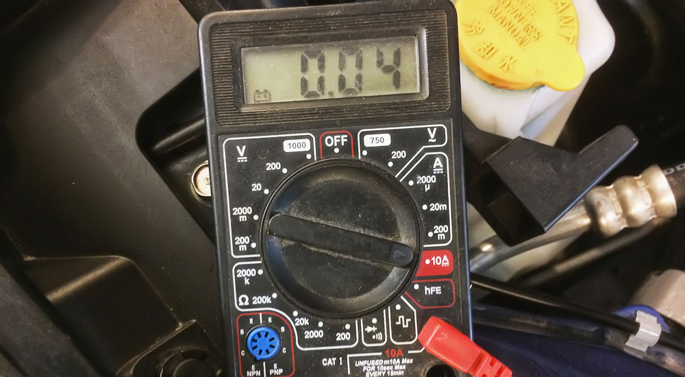Установите мультиметр в режим измерения постоянного напряжения (=U). Подсоедините щуп COM (черный) к минусу или металлической части кузова. Установите стояночный тормоз и поверните зажигание в положение ON (ВКЛ).