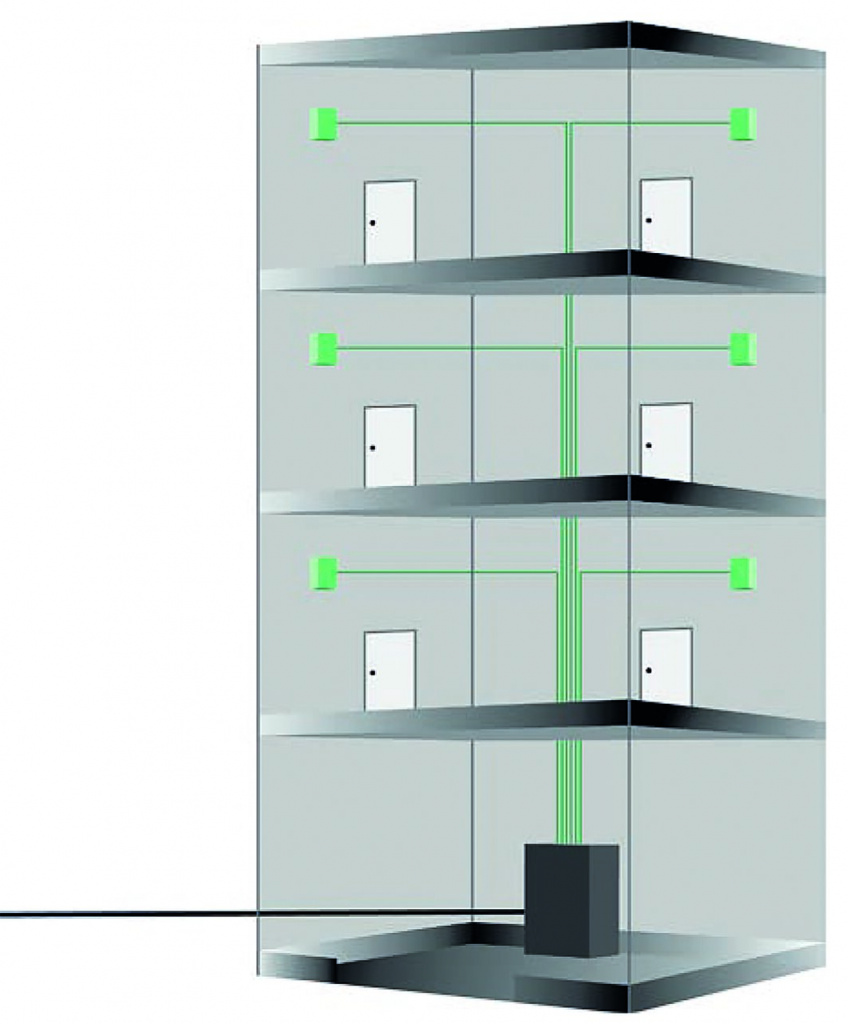 В высотках может быть один крупный стояк, в котором прокладывается несколько многоволоконных кабелей, каждый из которых обслуживает один или несколько этажей. При топологии, изображенной на схеме 3, одна распределительная коробка обслуживает три этажа. В нее заводятся все волокна многоволоконного кабеля, и выводятся абонентские отводы для трех этажей. Как вариант, в здании может быть не один стояк, а несколько, размещенных в параллель.