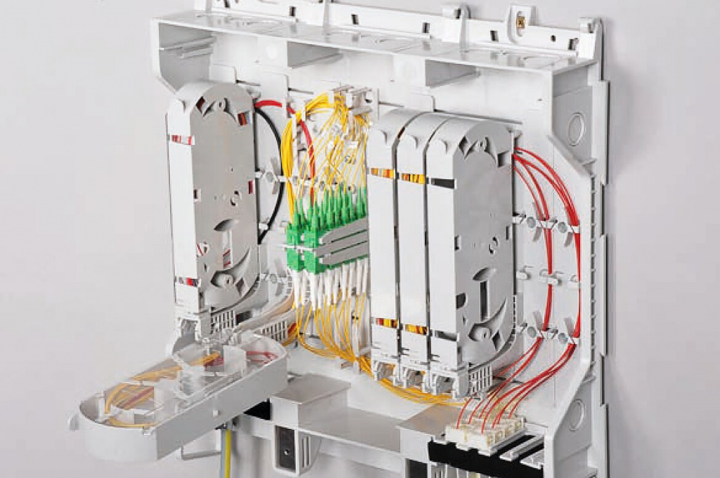 Заводимый в дом оптоволоконный кабель попадает в домовую распределительную коробку, которая обычно размещается в подвале или внизу одного из подъездов. В маленьких домах волокна сразу заводятся на кросс-панель (фото 1), на которой волокна входного кабеля коммутируются с волокнами стояковых кабелей. В более крупных зданиях распределительная коробка включает один или несколько сплиттеров PON и часто превращается в шкаф.