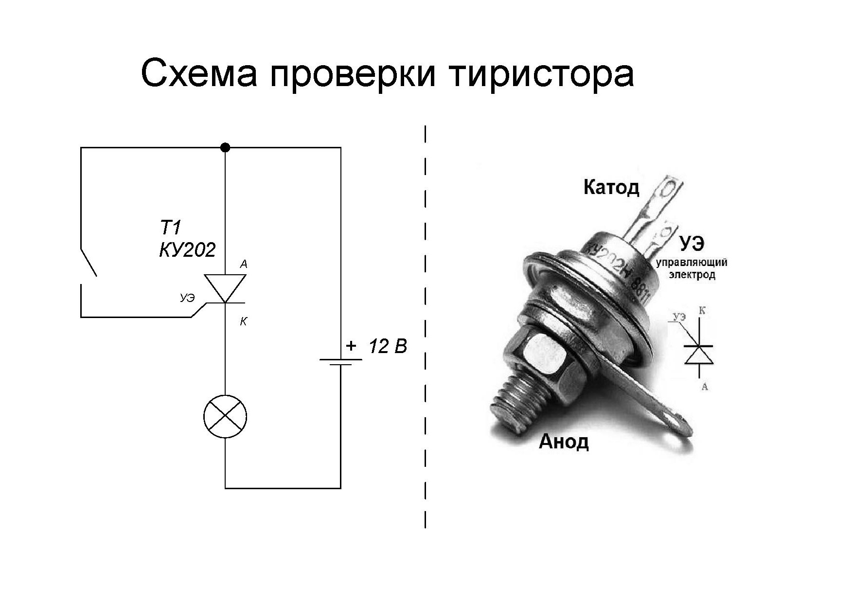 Проверка тиристора происходит следующим образом. Прикладываем красный щуп к аноду, а черный – к катоду. В окошке мультиметра должно отобразиться бесконечное сопротивление. После этого управляющий электрод соединяем с анодом, наблюдая за падением сопротивления на дисплее мультиметра до сотен Ом. Управляющий электрод открепляем от анода – сопротивление тиристора не должно измениться. Так ведет себя полностью исправный тиристор.