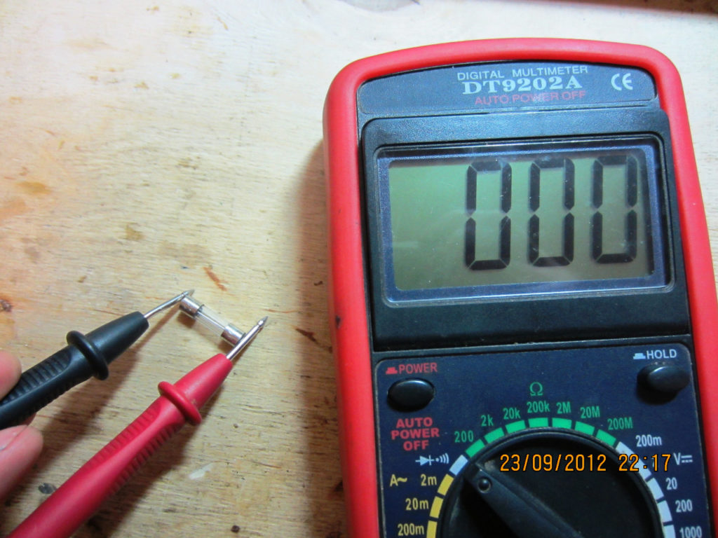 Это устройство, которое предотвращает перегрев элементов в цепи. Оно имеет вид маленькой пластины или цилиндра с тонким кабелем внутри. Для его тестирования щупы мультиметра прикладываются к разным сторонам. На режиме «прозвонка» при условии целостности предохранителя должен раздаваться звук.