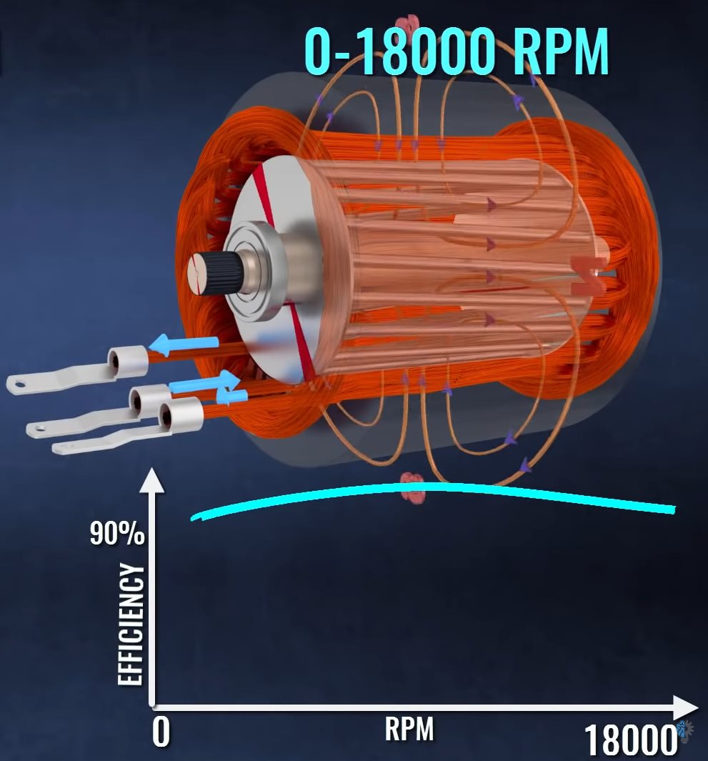 Скорость вращения двигателя может быть от нуля и до 18 000 оборотов в минуту! Как вы видите, почти во всем диапазоне эта зависимость почти равномерная. Значит, нет надобности в трансмиссии и коробке передач.
