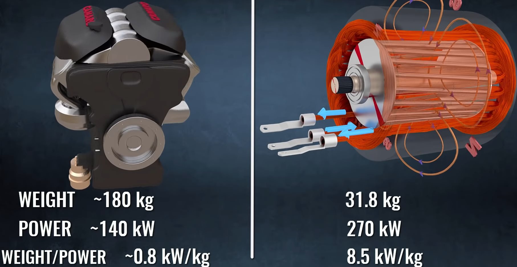 Если даже сравнивать ДВС и асинхронный двигатель, то можно увидеть существенную разницу весе и выдаваемой мощности. Отношение веса к выдаваемой мощности у ДВС 0,8 кВт/кг, а у асинхронного двигателя 8,5 кВт/кг. Разница более, чем в 10 раз!
