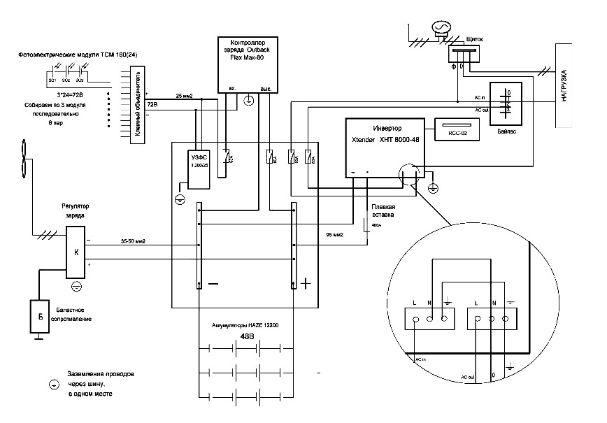 Затем подключаем инвертор, и заводим его на вводной электрощиток. Автономное энергоснабжение готово.