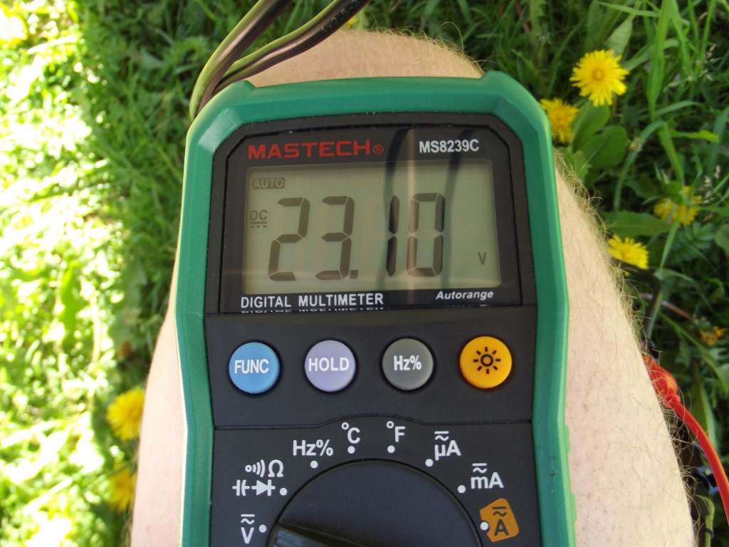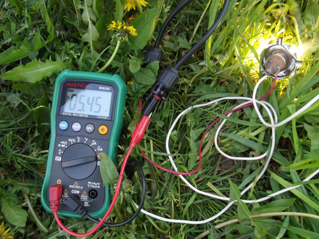 Направляю панель на солнышко и смотрю напряжение на клеммах в холостом режиме.