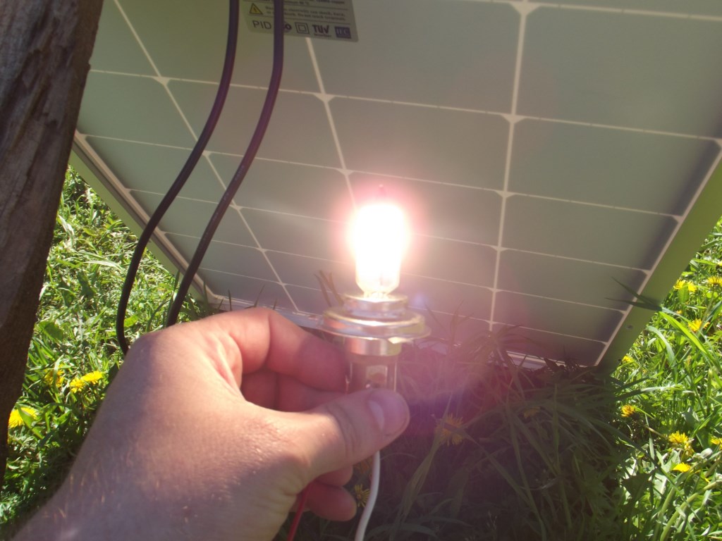 Давайте посчитаем, какую мощность кушает лампочка от панельки. Вспоминаем, что мощность – это произведение силы тока на напряжение. То есть получаем P=IU=5,45 x 16,2 = 88,3 Ватта. Как видите, панелька в легкую питает нагрузку, которая кушает 88,3 Ватта при напряжении в 16,2 Вольта. Честно говоря, более чем 14,4 Вольт подавать на лампочку не стоило бы, так как она автомобильная. Но вроде осталась жива.