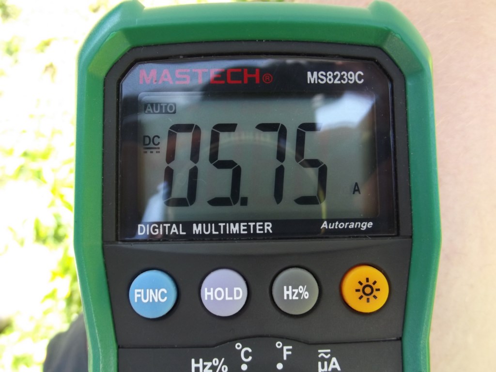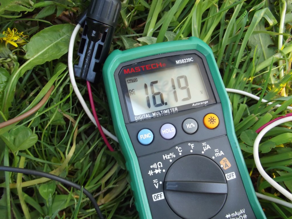 И еще, амперметр слева стоит на монокристаллической панели, думаю что это она меньше выдает, пошел опять смотреть на панели, ага, на монокристаллическую падает тень от столба возле дома (сразу даже не обратил внимание поэтому и не сфотографировал), а монокристалл не любит такой частичной затененности, что естественно сказывается на выработке