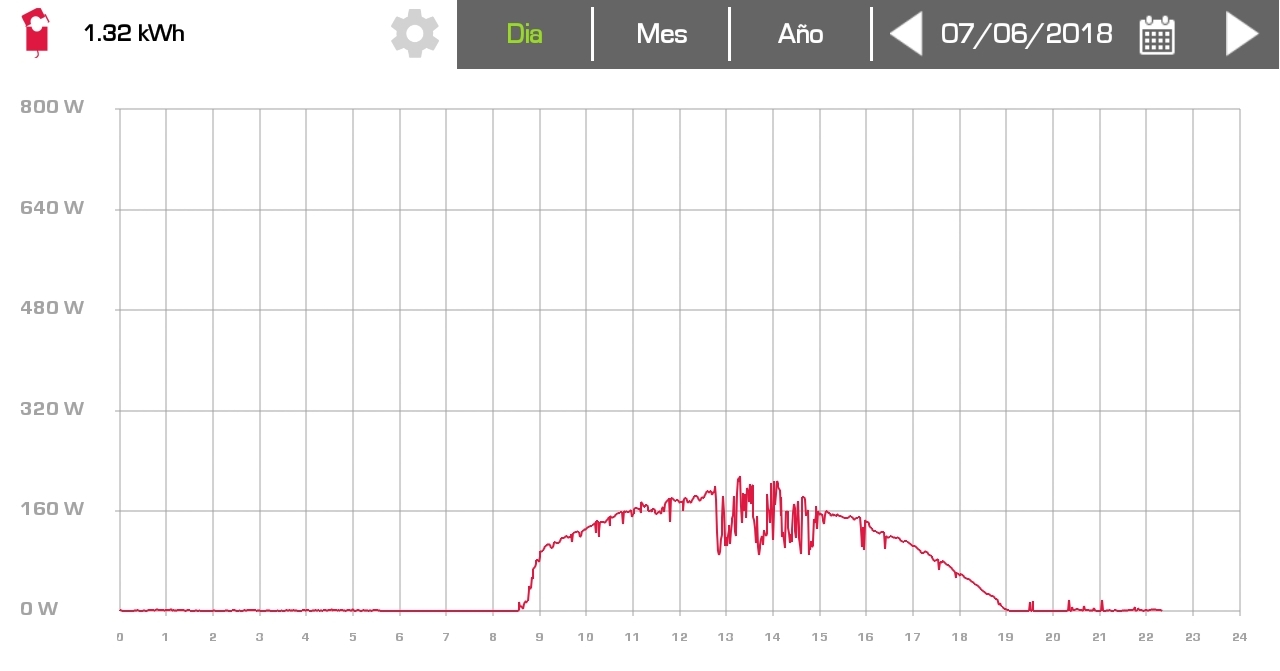 Примерно с 13:00 до 15:00 выработка электроэнергии была нестабильна из-за облачности. Но и это не сильно сказалось на итоговой производительности станции — 1.32кВт.