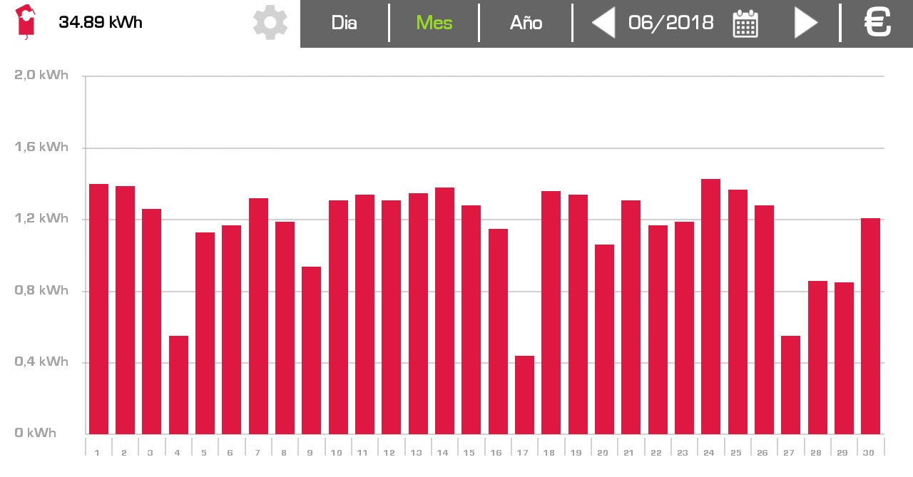 Из графика видно, что выработка непостоянна и присутствуют резкие спады – это пасмурные дни, когда световой день короче, а солнечная активность очень слабая. Худшая производительность была зафиксирована 17.06 — около 0.4кВт, а максимальная 25.06 — около 1.4кВт.