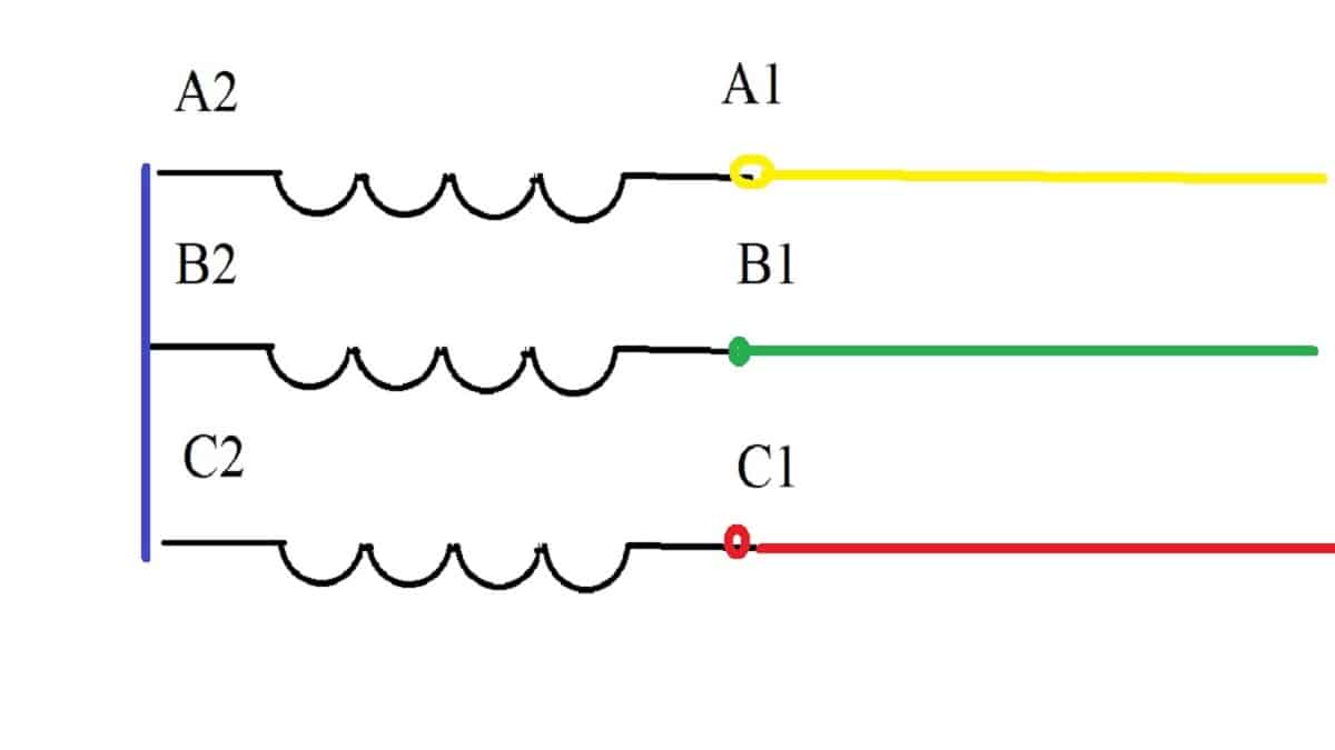 Как видите на рисунке, концы выводов обмоток трехфазного двигателя A2, B2, C2 соединены в один электрический узел. А к клеммам A1, B1, C1 – подключаются фазные провода, как правило, на 220 или 380 вольт.