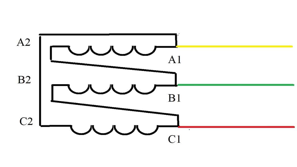 Как видите, соединение производится от A2 к B1, от B2 к C1, от C2 к A1, в некоторых моделях электрических машин маркировка выводов может отличаться, но на крышке борна будет отображаться их принадлежность к той или иной обмотке и возможные варианты соединения между собой.