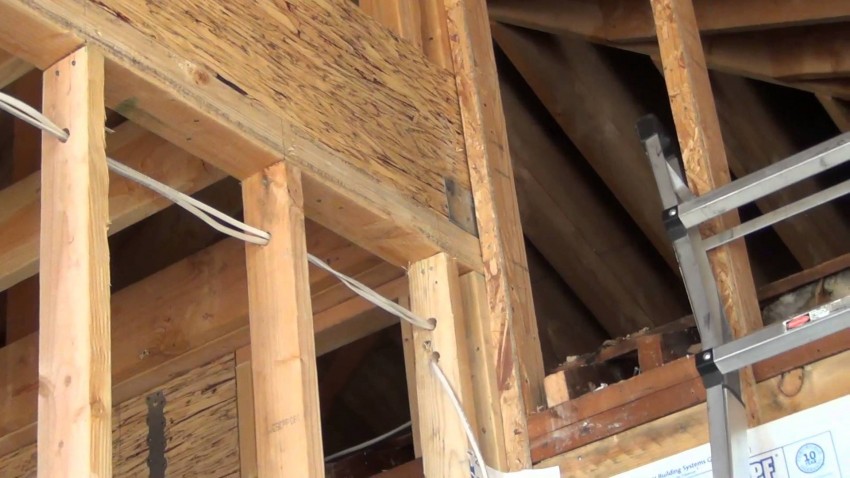 В течение нескольких лет после строительства деревянного дома происходит его усадка, поэтому неизбежно провисание проводов. Чтобы сохранить приятный внешний вид линий без подтяжки, провода закрепляют стяжками над и под изоляторами.