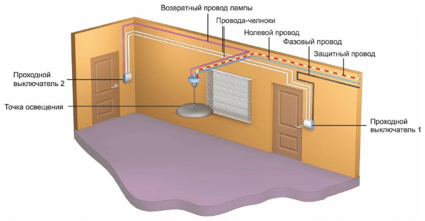 Так же необходимо установить и разветвительные коробки, которые распределяют провода по комнате. Если, в помещении есть необходимость провести заземление, то в этом случае необходимо использовать провода на три жилы.