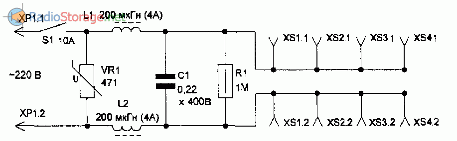 На рис.2 приведена типовая схема сетевого фильтра питания. На ней показана трехпроводная (европейская) сеть питания: “фаза” — “ноль” (“нейтраль”) — “земля”. Сразу на входе фильтра стоит варис-тор VR1.