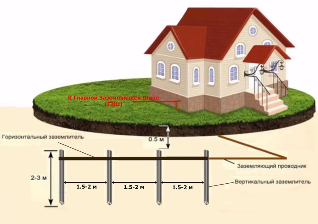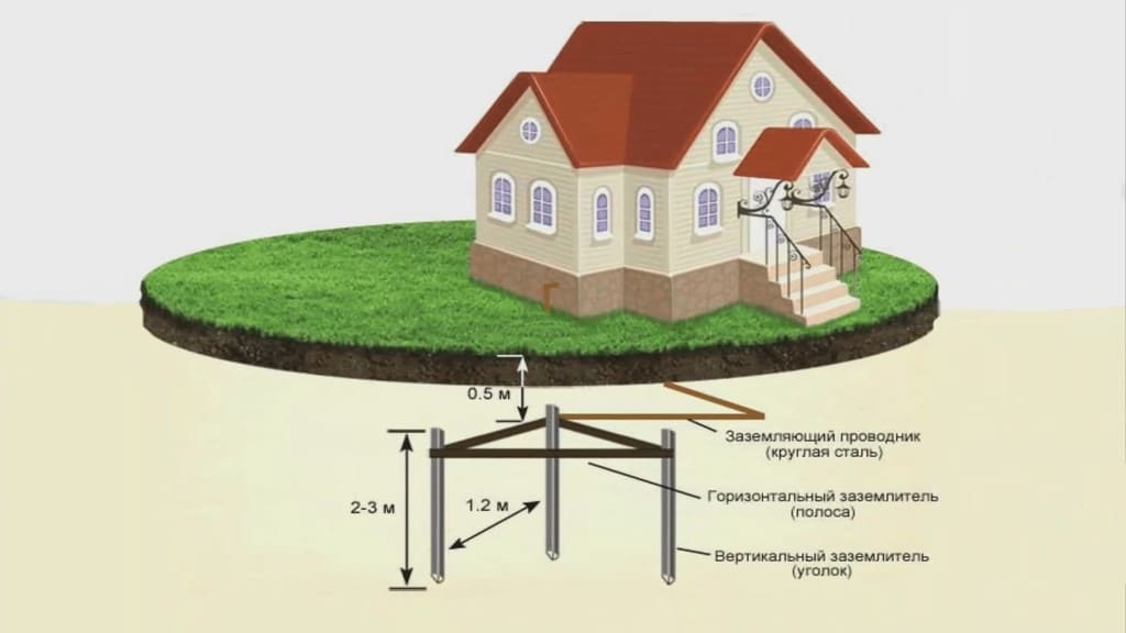 Отметим, что заземление должно быть обустроено ниже отметки промерзания грунта. В обратном случае, зимой, устройство будет выполнять свои функции, только частично. При конструировании следует учесть, что контур заземления, должен располагаться на расстоянии 1-10 метров от жилой постройки, для отвода на определенное расстояние, необходимо прокопать траншею и проложить контур.