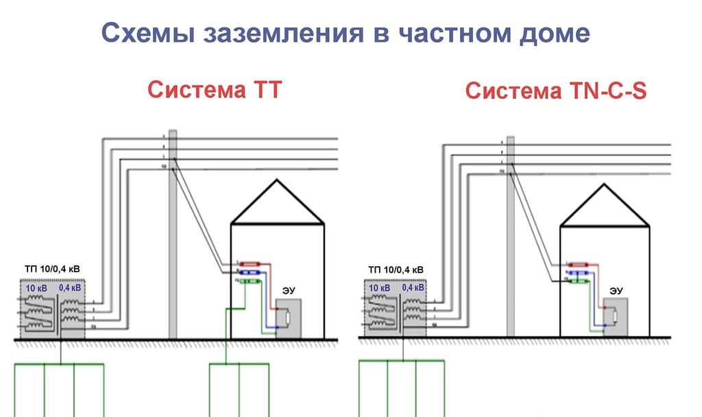 Система ТТ очень похожа на TN-S. Отличие в том, что проводник заземления не уходит на подстанцию к заземлителю, а располагается непосредственно на участке рядом с домом. На подстанции система заземления сделана специалистами по всем правилам устройства электроустановок (ПУЭ). На личном участке придется сделать то же самое.