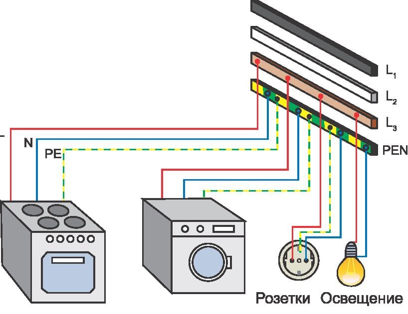 Организация данной схемы проводится с помощью разделения кабеля на нейтральные и жилу заземления, для этого, необходимо 3 шины, одна, из которых будет земляная, другая диэлектрическая и третья будет выполнять расщепительную функцию для подключения напряжения.