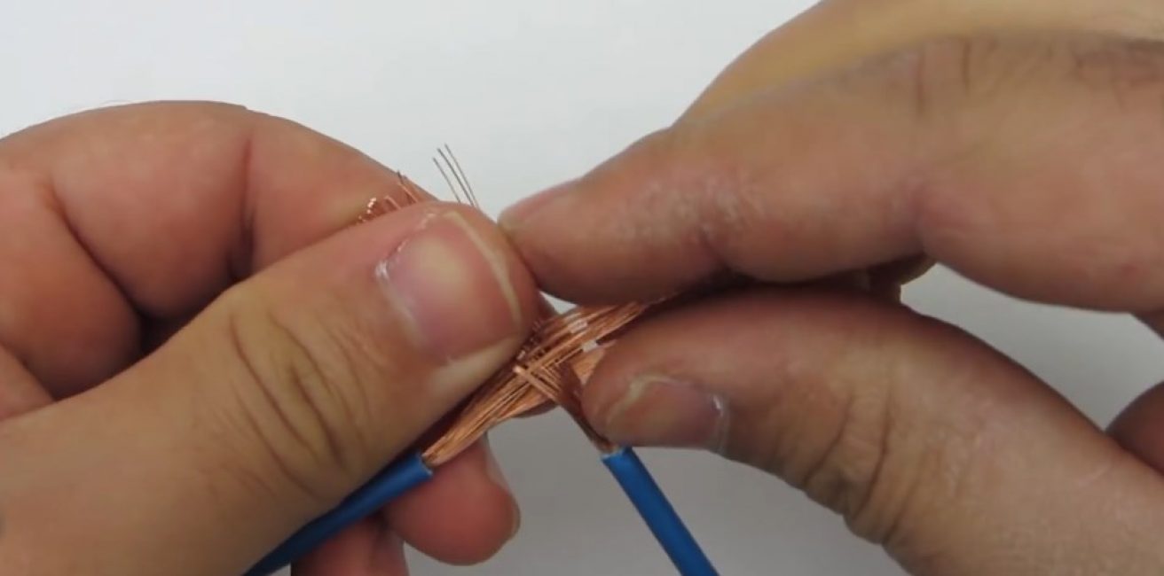 Сжимая пальцами кончики жил у места соединения одного провода, другой рукой накручиваем жилы другого в сторону изолирующей оплётки.