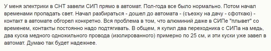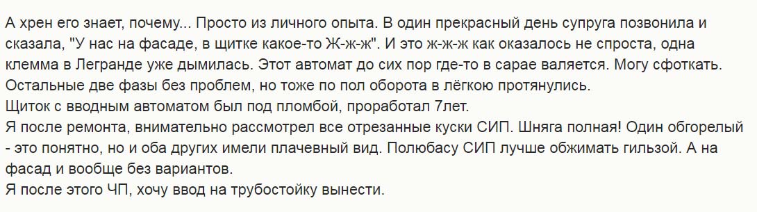 Вследствие этого через пару тройку лет контакт начинает греться и подгорать, изоляция СИП плавится.