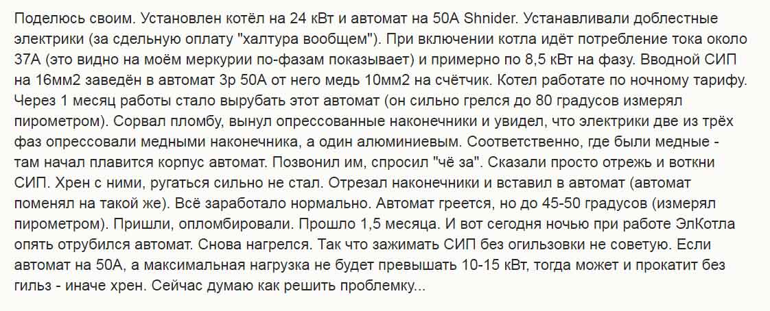 Причем концы СИП снова подключены тем же способом. А значит – проблема может повториться. Плюс – нужно отметить, что номинал установленного вводного автомата ниже (был 63 – стал 40 А), а значит, максимальный ток СИП будет ниже. Но вопрос: надолго ли хватит? – остается актуальным.