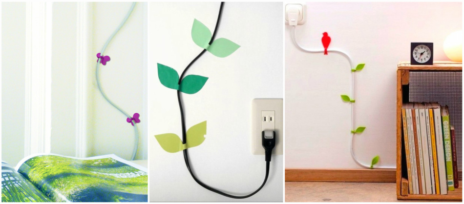 Сейчас в магазинах техники можно приобрести резиновые или силиконовые накладки, которые крепятся на липучках, представляют собой разветвленное дерево с листиками, внутри которого и прячутся провода. Таким образом на стене образуется композиция. В качестве клипс или зажимов могут использоваться птицы, бабочки, листики. Подробнее можно посмотреть на фотографиях. В таком дизайне можно приобрести обычные клипсы, а также стяжки для проводов.