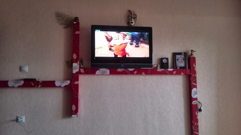 Если телевизор располагается на подставке или столе, то можно прибить шнуры строительным степлером к ножкам или задней стенке предмета интерьера. Розетку лучше установить за телевизором, или наоборот. В крайнем случае проштробить канавку за телевизором в стене и по ней пустить электропроводку. После чего заложить штробу гипсом и провести отделку.